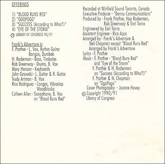 Frank's Adventure were a great Toronto live band who were around during the early 90's let by Frank Prather. This is the only album of theirs which I'm aware of. I bought it at a show at Clinton's Tavern.
